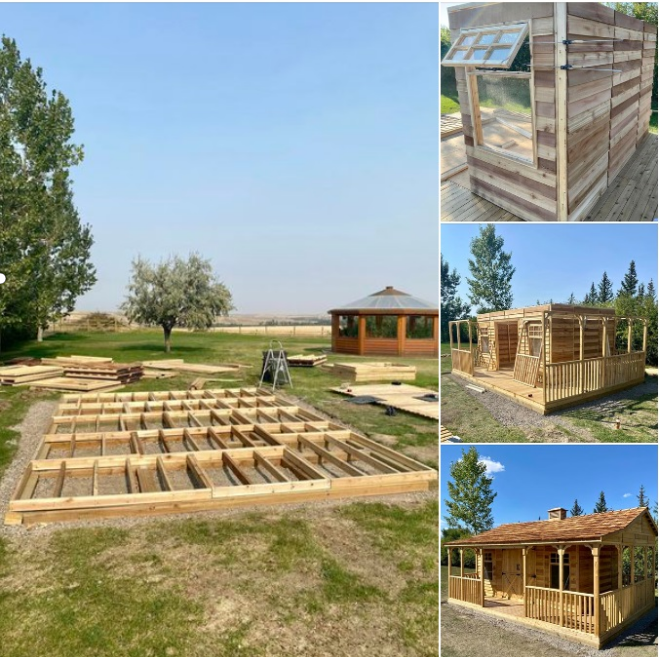 Floor: Pre cut 2x4 western red cedar floor joists, 12” spacing. Pre cut 5/8” plywood